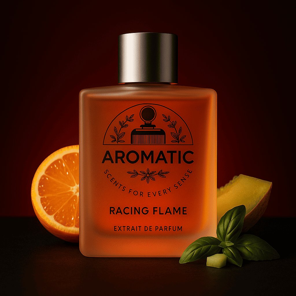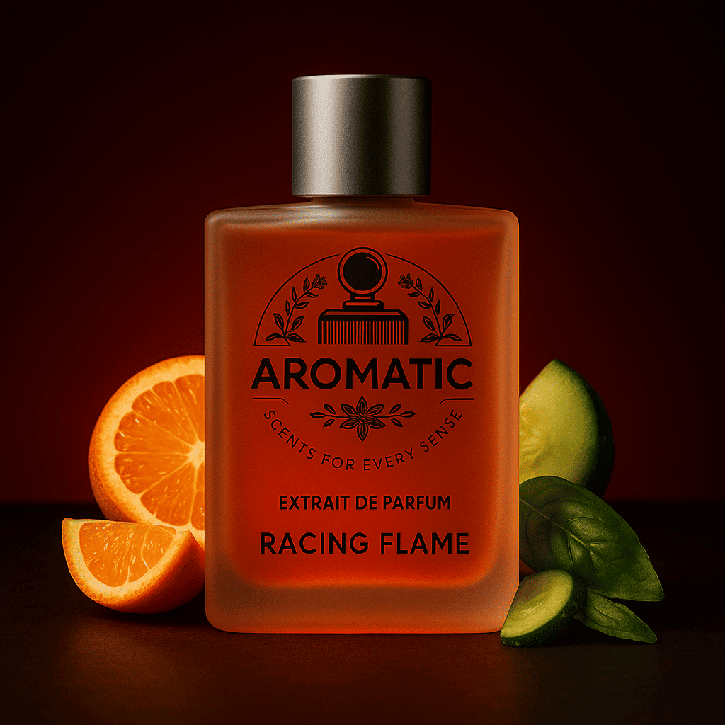 Racing Flame is a bold, masculine fragrance featuring top notes of Melon, Cucumber, and Mandarin Orange, heart notes of Basil, Sage, and Geranium, and base notes of Musk, Woodsy Notes, and Suede.