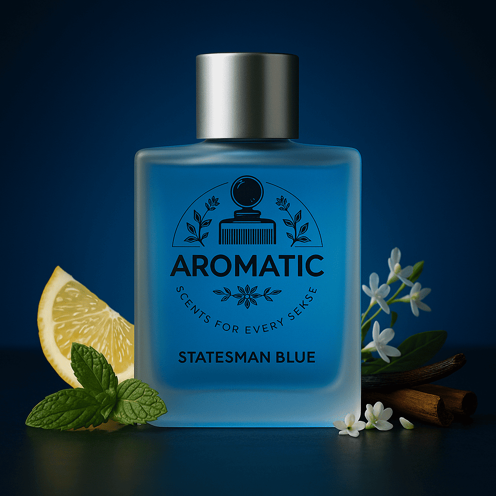 Statesman Blue is a bold, masculine fragrance featuring top notes of Citrus, Mint, heart notes of Spices, Floral Notes and base notes of Wood, Musk.